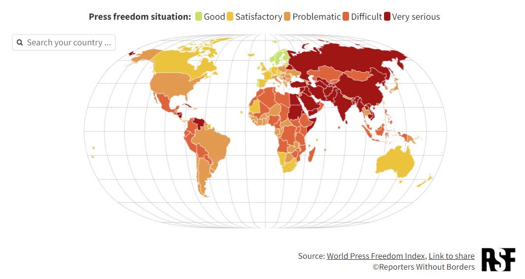 根据无国界记者组织发布2024年世界新闻自由指数,中国排名第172(2023年第179),世界倒数第9;越南排名第174(2023年第178),世界倒数第7;朝鲜排名第177(2023年第180)。参与统计的一共才180个国家。其中厄立特里亚去年排名第174,今年排名第180,世界垫底。