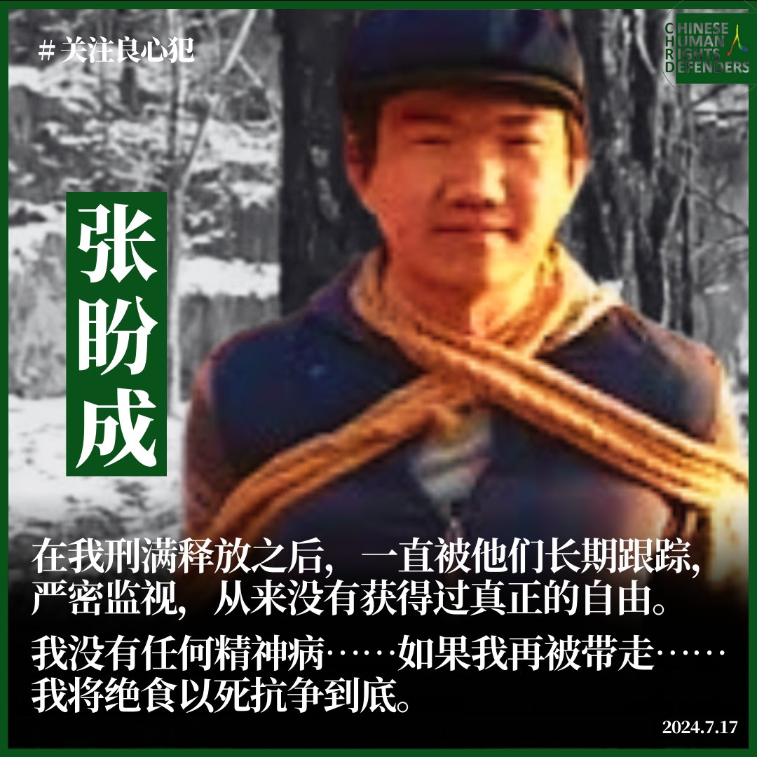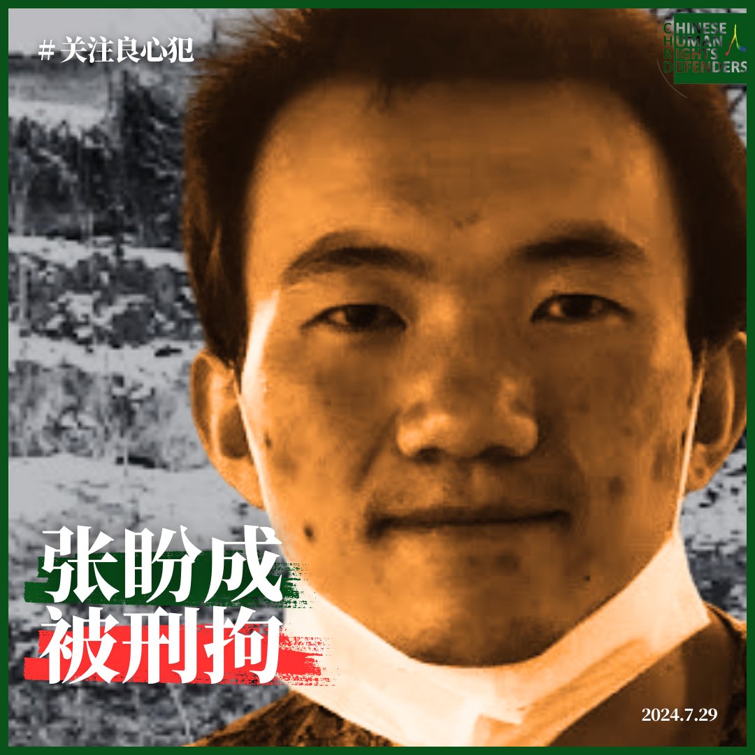 据维权网报道,被强迫失踪多日的 #张盼成 已被刑拘。7月13日,张盼成曾发表声明,表示今年2月刑满获释后,一直被长期跟踪,严密监视,从未获得过真正的自由;当地多次上门要将其认定为“精神病”,并表示如果自己再被带走,将绝食以死抗争到底。张盼成此前两度因言获罪,被以寻衅滋事罪判刑四年半。
