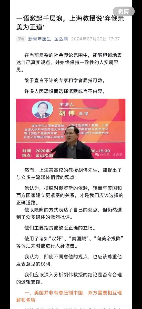 上海党校教授胡伟要求弃俄亲美引发关注A