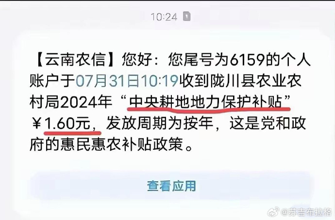 近日,一位云南网友晒出了当地政府发放的“中央耕地地力保护补贴”仅有1.6元人民币。另一位来自广西的网友表示他一共二十几亩地也只有955元,并且还比往年少了一半。