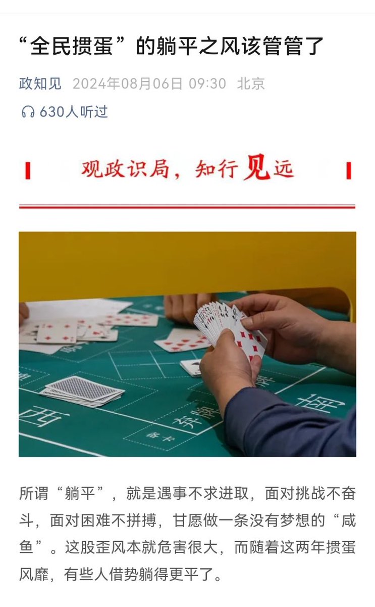 《北京青年报》80后新主编毛晓刚一上任该报就连发两篇文章猛烈抨击“掼蛋游戏”是“佛系”生活和“躺平”风气的代名词。做奴隶的姿势不对也让你不满意。中国人如果不躺平,跟伊朗人、孟加拉人和委内瑞拉人一样激烈反抗暴政,你是不是就满意了?不要指望年轻一代中共党员开明,反而年轻一代更保守更极端。