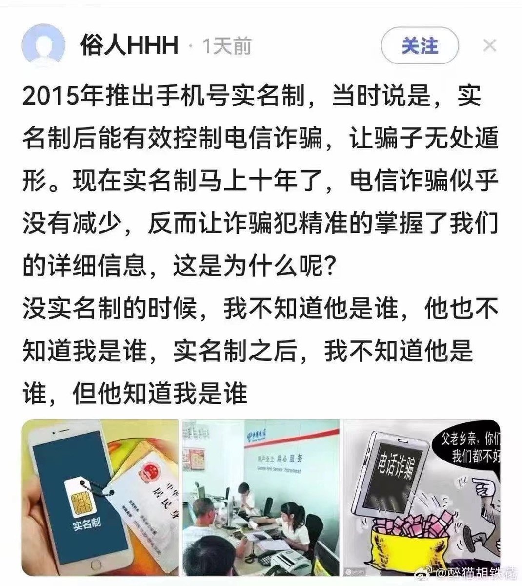 看他们的过去,就可以知道他们的现在;看他们的现在,就可以知道他们的将来…… 【2015年推出手机号实名制】 当时说是,实名制后能有效控制电信诈骗,让骗子无处遁形。现在实名制马上十年了,电信诈骗似乎没有减少,反而让诈骗犯精准的掌握了我们的详细信息,这是为什么呢? 没实名制的时候,我不知道他是谁,他也不知道我是谁,实名制之后,我不知道他是谁,但他知道我是谁
