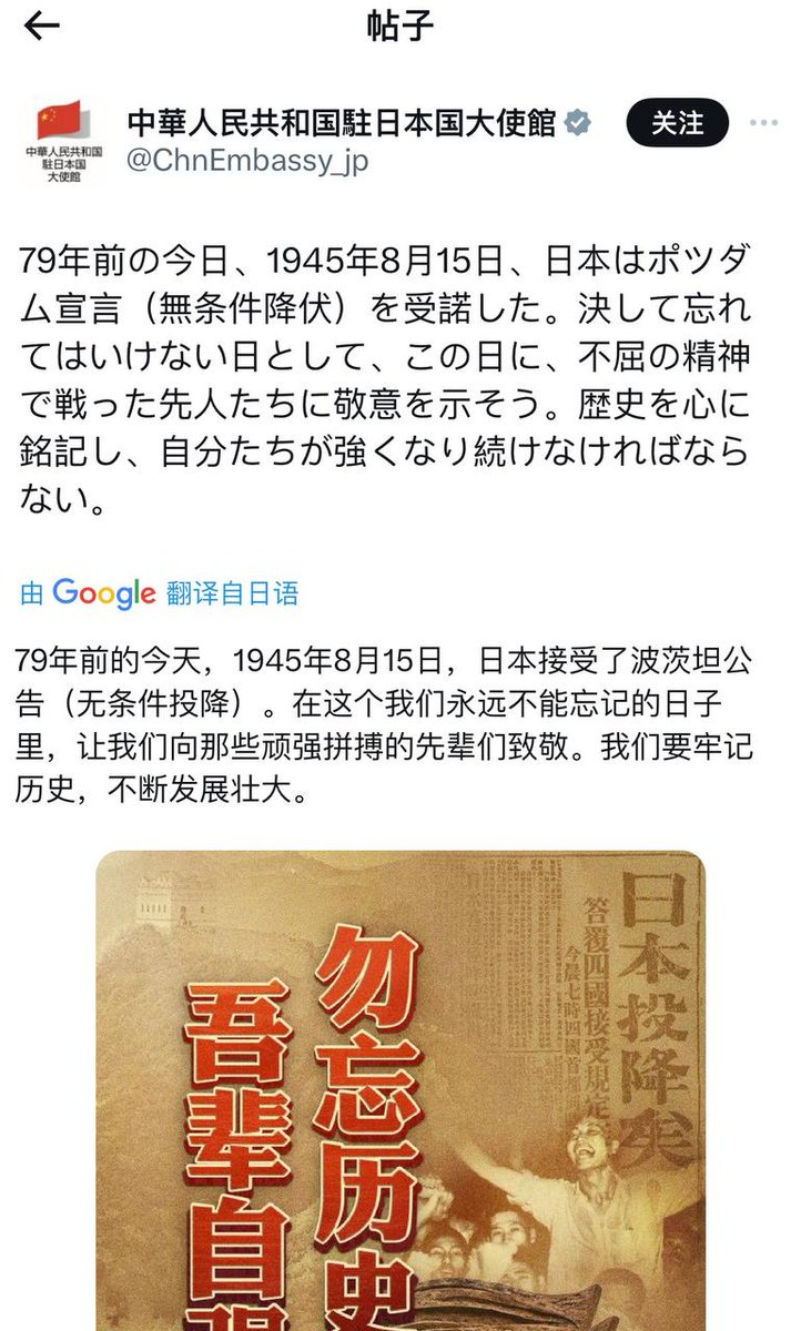中国驻日大使馆的帖子,遭到了解历史的日本人如此回复: