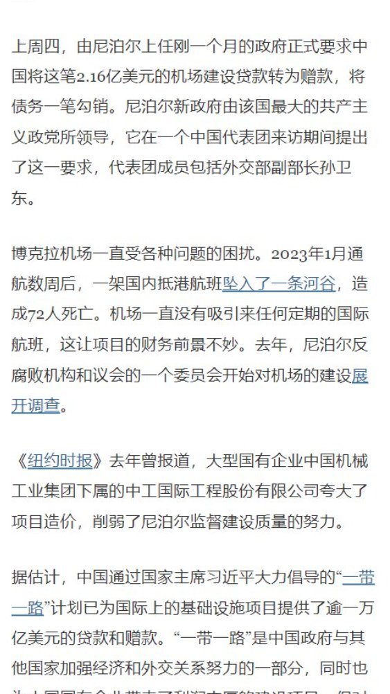 8月26日,纽约时报报道,尼泊尔政府正式要求中国将“一带一路”项目博克拉机场2.16亿美元的建设贷款转为“赠款”,将债务一笔勾销。