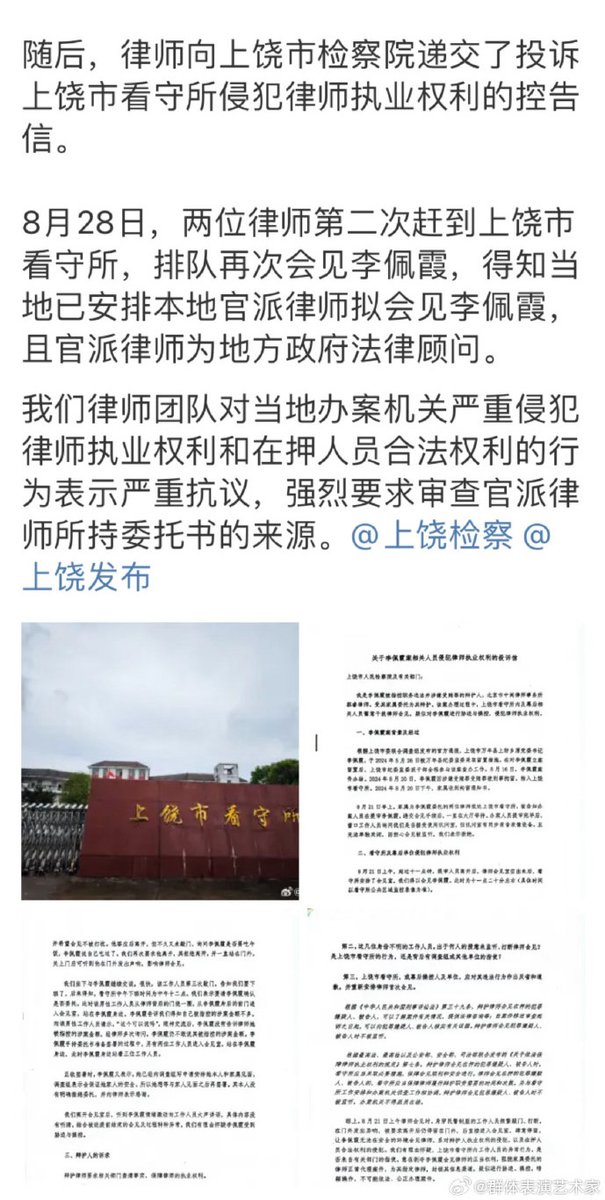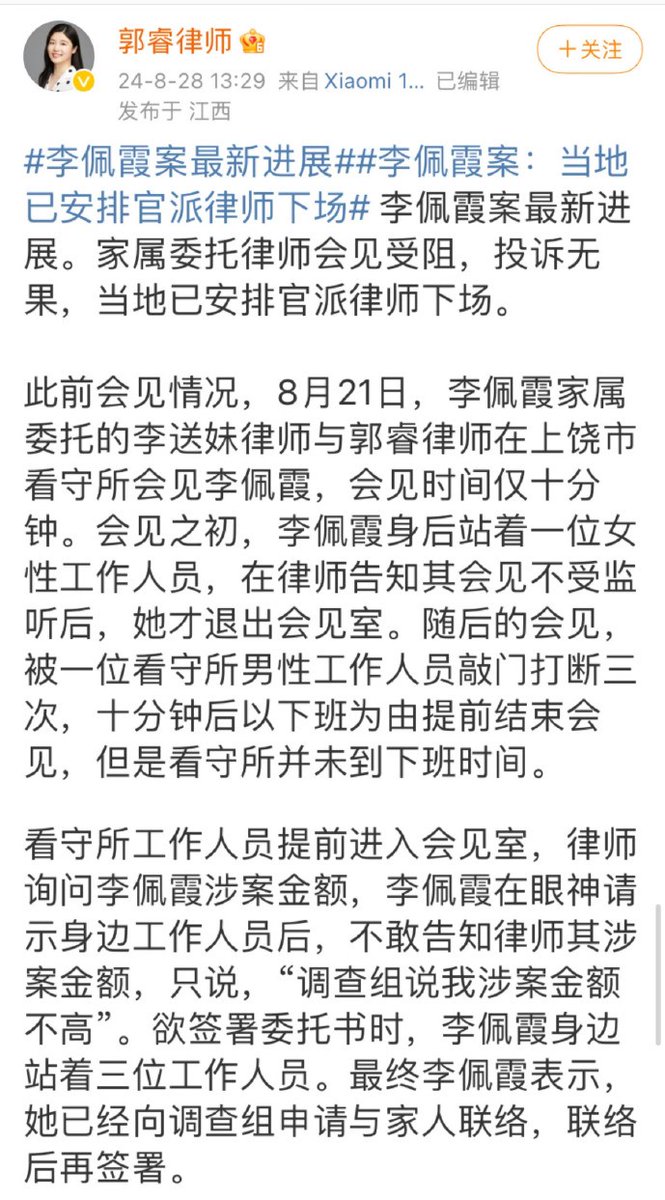 8月28日,江西。李佩霞家属委托的律师披露了李佩霞案最新进展:8月21日,律师来到上饶市看守所会见李佩霞,会见时间仅十分钟。投诉无果,当地已安排官派律师下场。