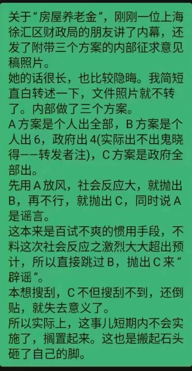 1 【关于”房屋养老金”,刚刚一位上海徐汇区财政局的朋友讲了内幕,还发了附带三个方案的内部征求意见稿照片】