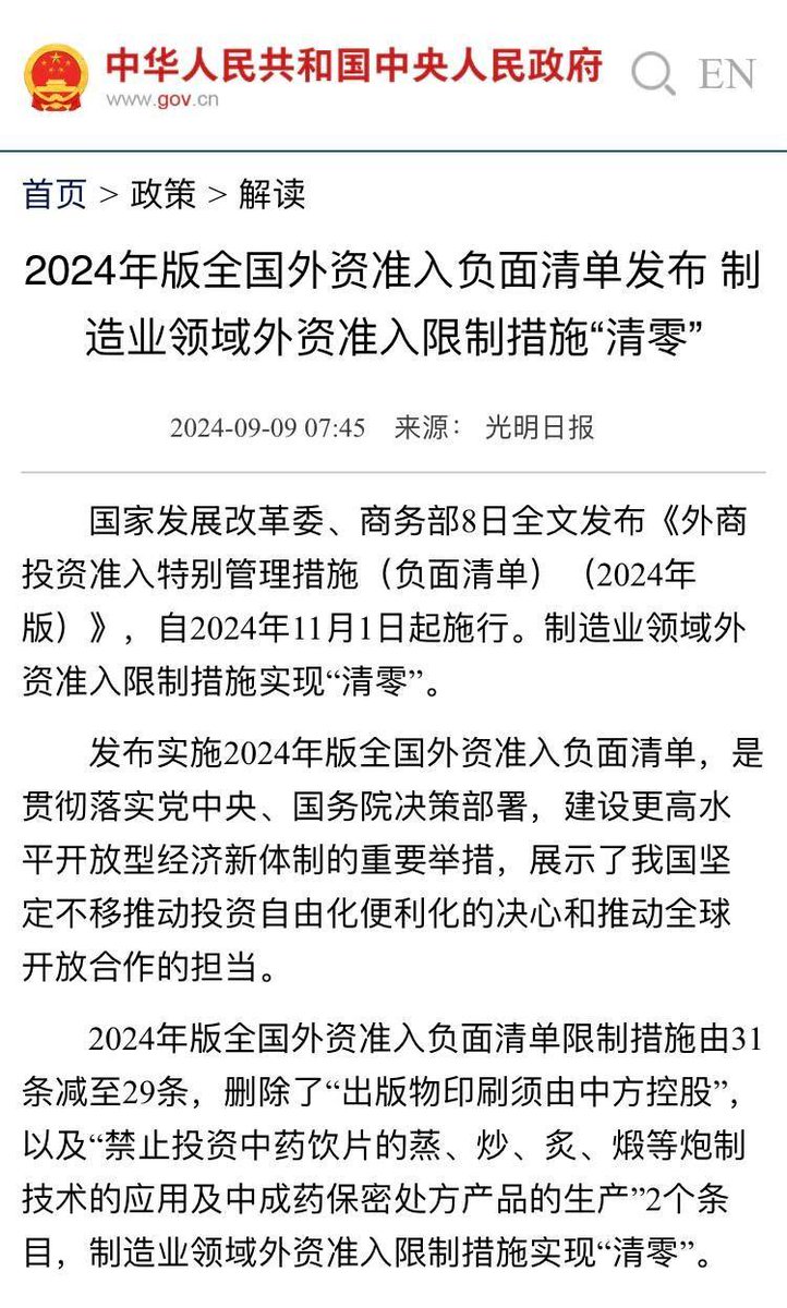 9月8日,国家发展改革委、商务部发布《外商投资准入特别管理措施(负面清单)(2024年版)》,“清零”制造业领域外资准入限制措施。同一天,商务部、国家卫生健康委、国家药监局联合宣布(在10年前基础上)进一步扩大外商独资医院试点。中国政府一边出台鼓励政策一边取消制度限制来吸引外国投资。