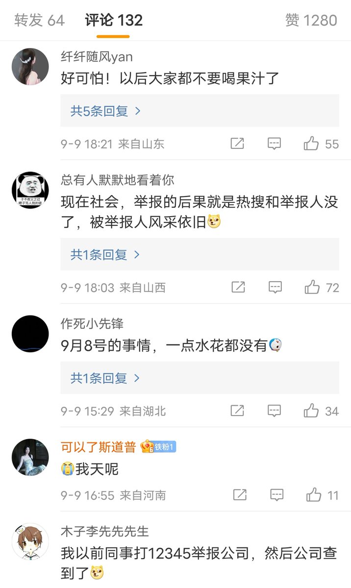 陕西曝光“烂苹果做果汁”的那位网友现在频繁遭遇电话威胁,工作也丢了。该网友试图报警,警察说恐吓电话不是实质性伤害,无法处理。此外,果汁的检验报告是“合格”。