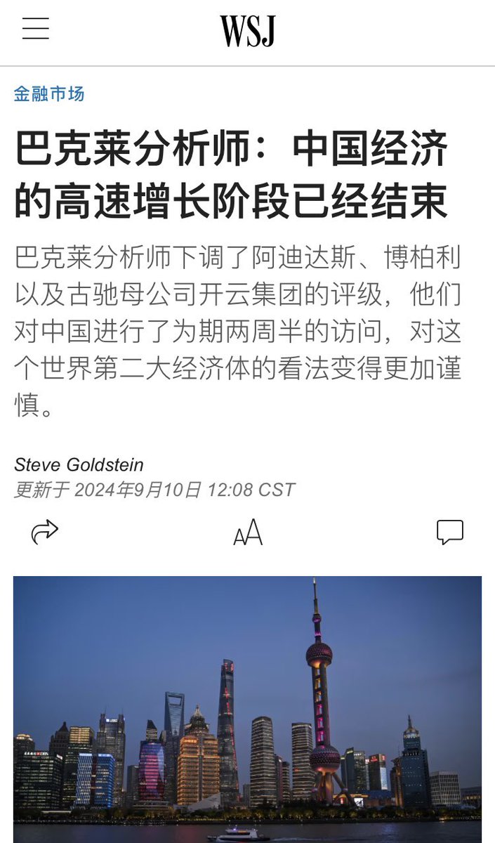 巴克莱(Barclays)分析师:中国市场疲软是结构性的,中国经济高增长阶段已经结束。