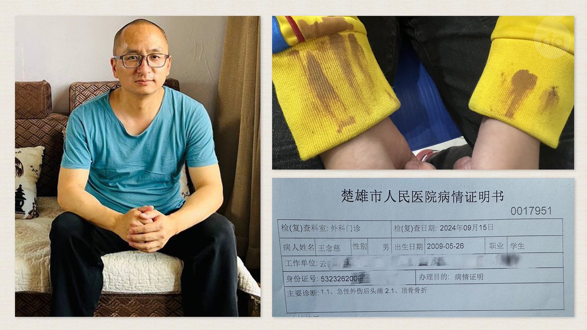 【异议诗人王藏之子遭 #校园欺凌 警拒立案】刚刚出狱的中国异议人士 #王藏 之子 #王念慈,上周在校园内被4名高年级同学围堵在洗手间,并遭殴打致口鼻流血。医院诊断为“急性外伤性头痛”和“顶骨骨折”,但云南楚雄当地派出所拒绝立案调查。