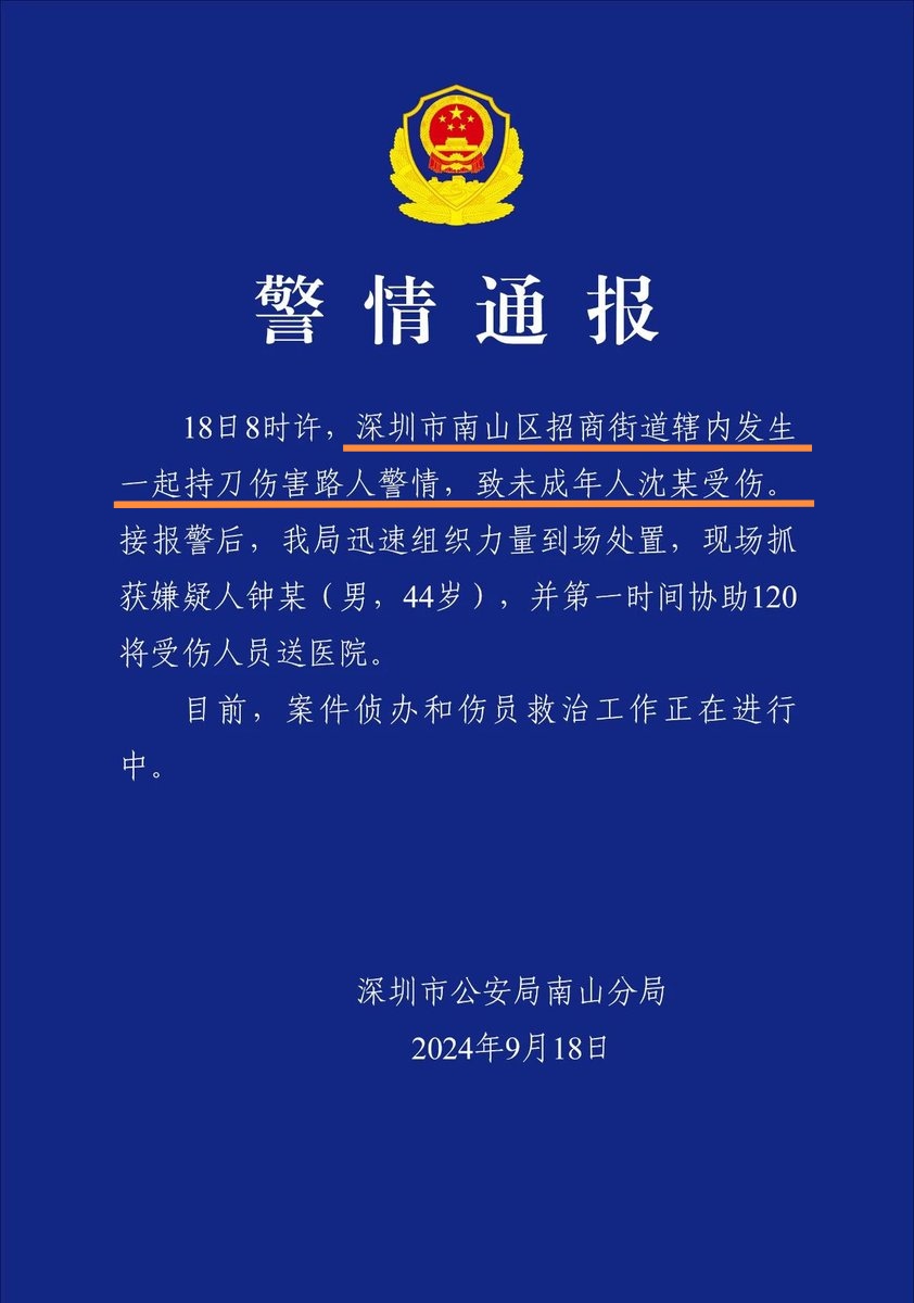 中国警察は、「招商街道りで通行人が刃物を持ってけがをし、未成年者の沈さんがけがをした」と発表しました。被害者が日本人であることには一切触れませんでした。