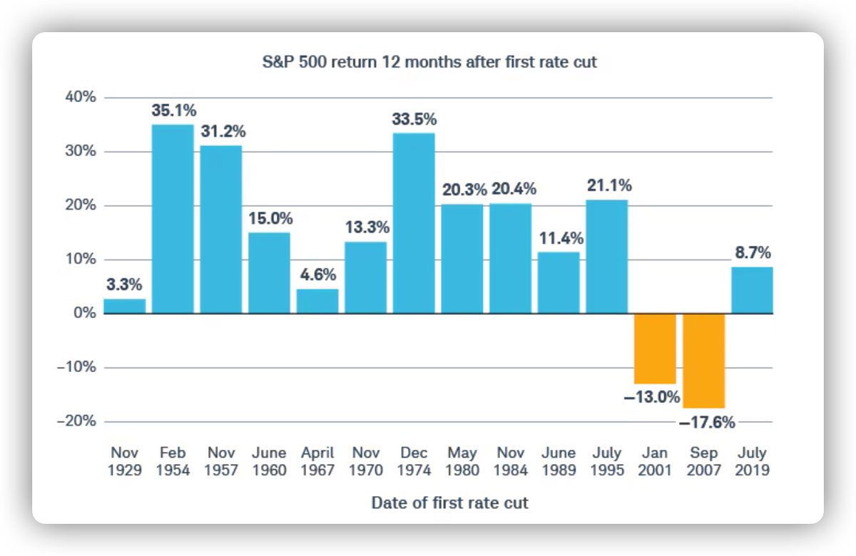 衰退情况下的降息、和没有衰退情况下的降息,资本市场的反应是不一样的,所以不能像一部分人,总是觉得降息股市就要下跌了,因为他们只看了美联储历次降息周期中的2001年和2007年,看了这张图你就会发现,他们这是选择性地看,美联储从1929年来这么多次的降息周期,他们却选择性地忽视除了2001年和2007年降息后12个月内的股市的上涨。