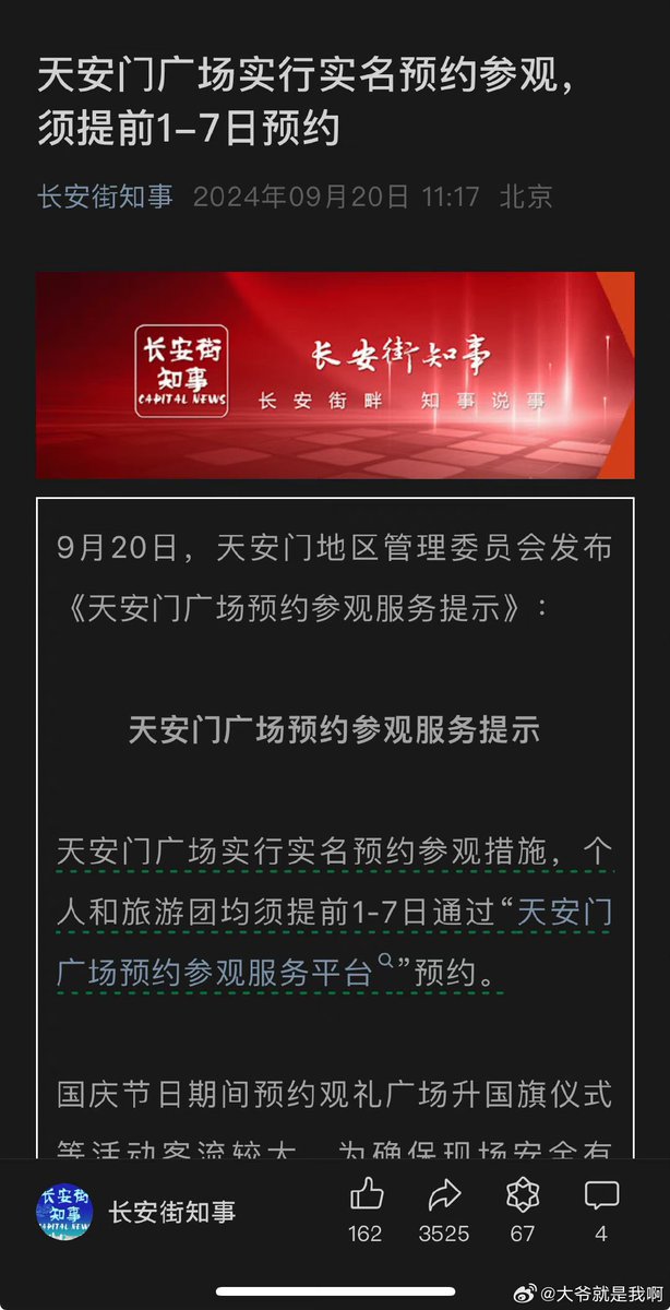 9月20日消息,国庆临近,天安门广场实行预约参观措施,个人和旅游团须提前1-7日通过“天安门广场预约参观服务平台”预约。