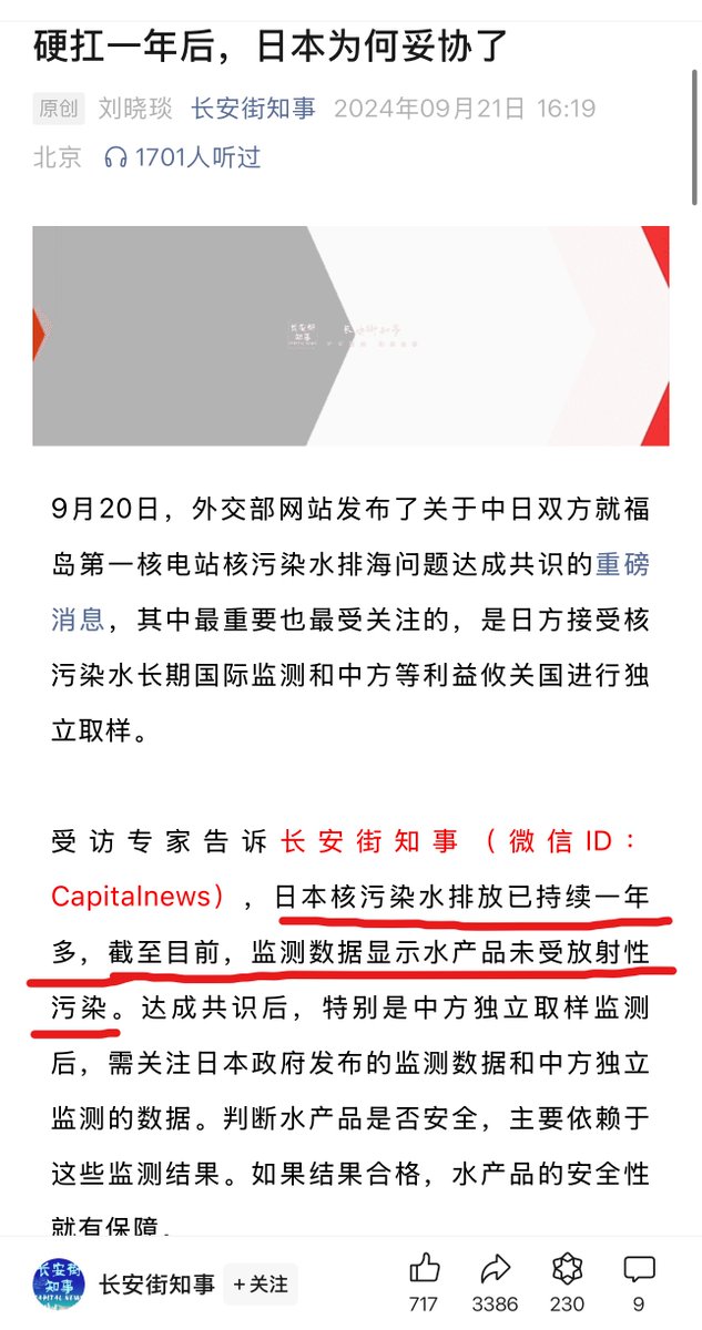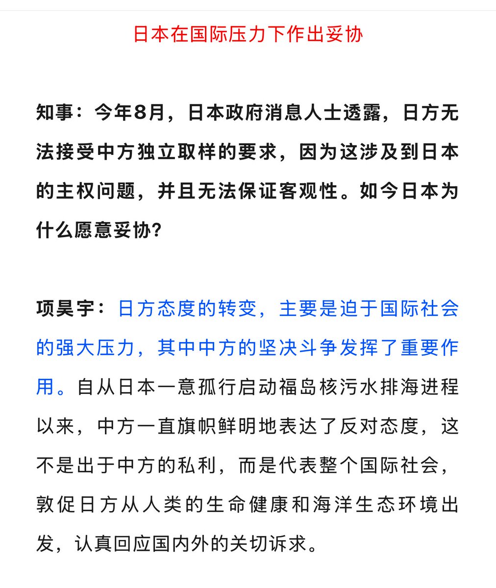 9月21日,公众号“长安街知事”发文:硬抗一年后,日本为何妥协了。文中提到日本核污染水已持续排放一年多,截至目前,监测数据显示水产品未受放射性污染。日本接受中方独立采样的要求,主要是迫于国际社会压力,其中中方的坚决斗争发挥了重要作用。