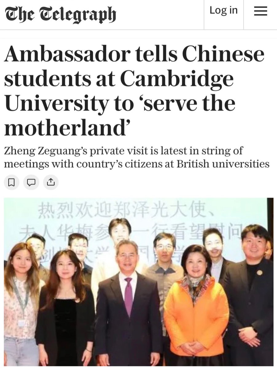 University of Cambridge hosted a private visit from the 🇨🇳 ambassador to the UK Zheng Zeguang (郑泽光) on Sep 12, during which he told 🇨🇳 students to “serve the motherland”.