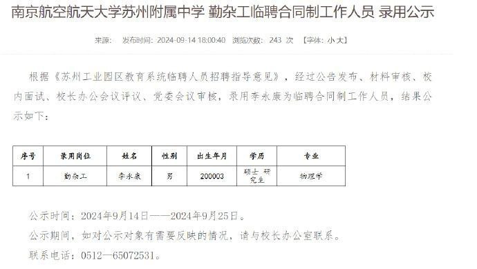 近日,一则“南京航空航天大学苏州附属中学勤杂工临聘工作人员的录用公示”显示,一名24岁物理学研究生拟被聘为该学校勤杂工,引发网友热议。新京报记者从南航苏州附属中学获悉,当事人尚缺论文发表,暂未获取硕士学位证书,没有竞聘教师的资格,看到勤杂工招聘启事后决定应聘。