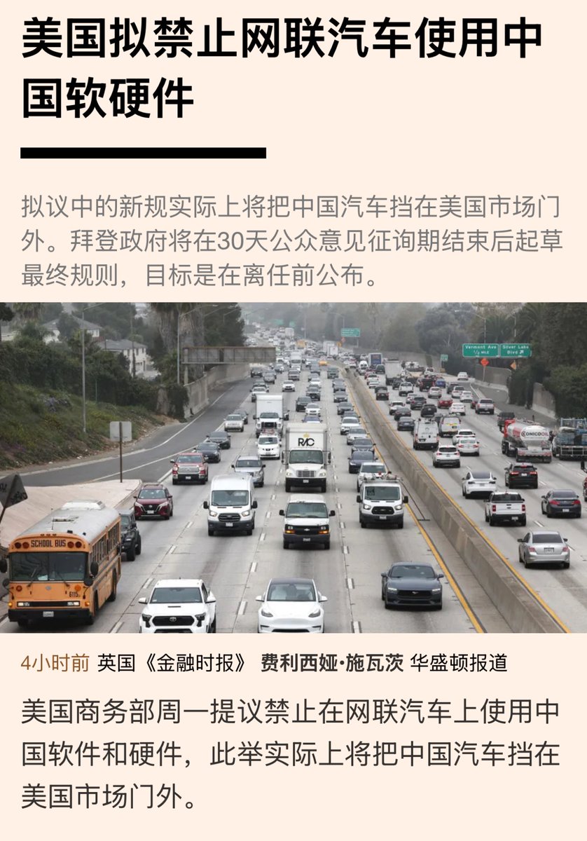 金融时报消息美国拟禁止在网联汽车中使用中国任何的软硬件