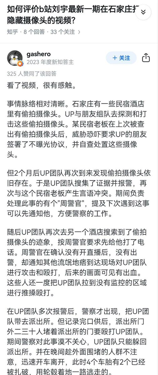 河北上大分:9月23日,博主“影子不会说谎”发布多段视频显示,他和另一博主在河北石家庄的多家民宿发现隐藏的针孔式摄像头。他们报警后,遭到酒店、民宿老板的围堵,还被疑似是警察派来的地痞流氓殴打。停在派出所外面的车辆也被放了气。这件事引发网友激烈讨论。