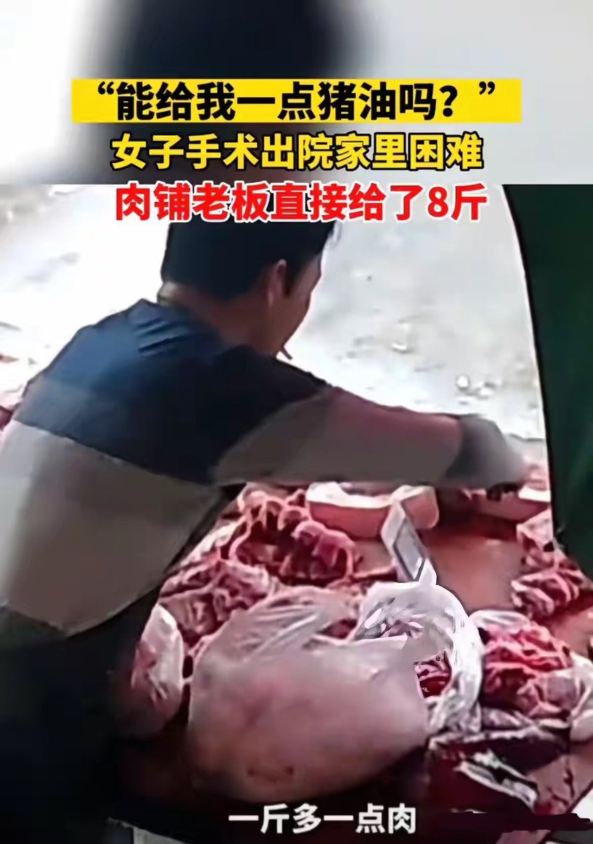 女子开心的有些不知所措,她连忙告诉潘大哥:真是谢谢您,稍微给我一点就行,我实在是没钱了才想着来找点猪油吃,我刚做完手术,把家里的钱都给花光了,实在是没办法了。
