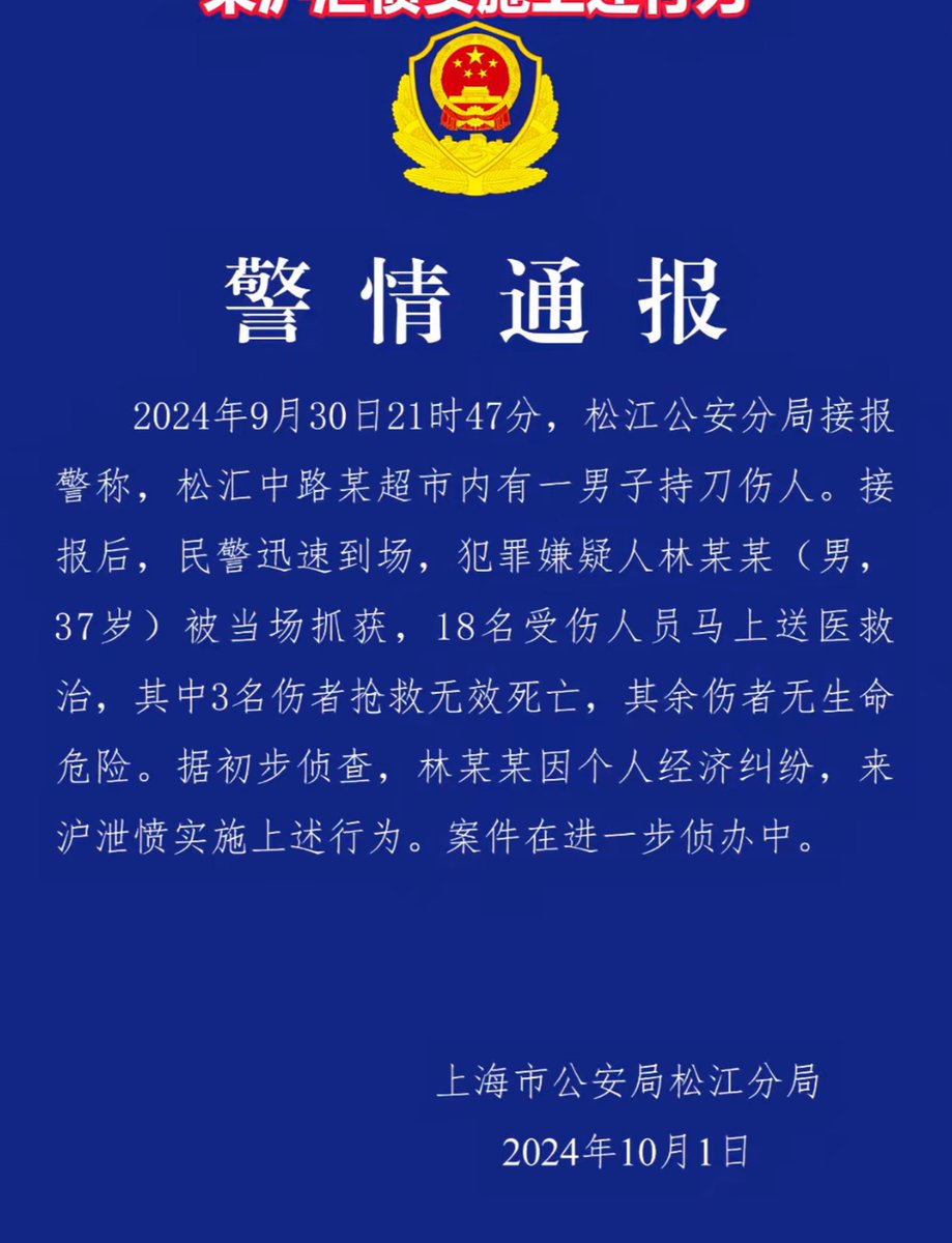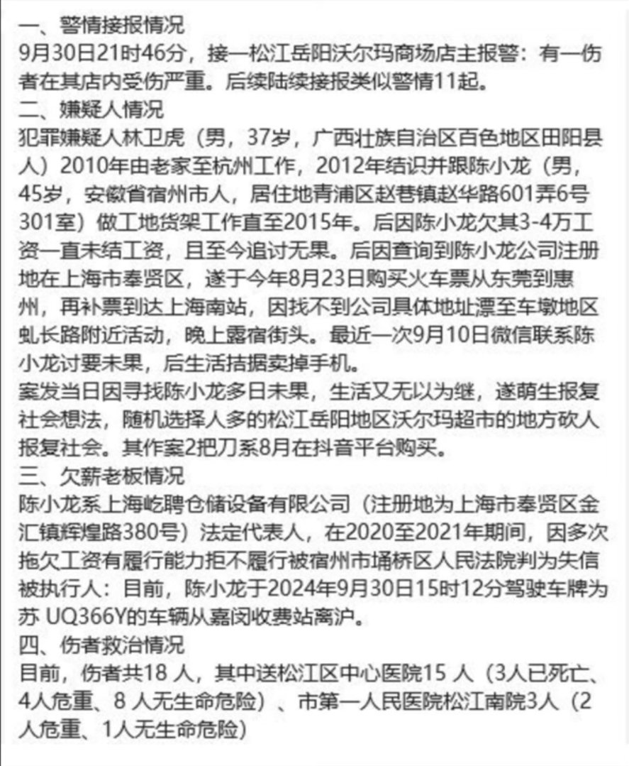 近日上海发生一起持刀伤人事件,造成三死15伤。10月1日网传一则松江区就此事向上级部门的汇报材料,当中提到犯罪嫌疑人林卫虎广西人。2012年来杭州后结识了陈小龙,并从事工地货架工作。后因陈小龙欠其3-4万元工资至今讨要无果,得知陈小龙居住在上海,遂于今年8月23日从东莞坐火车到上海,因找不到陈