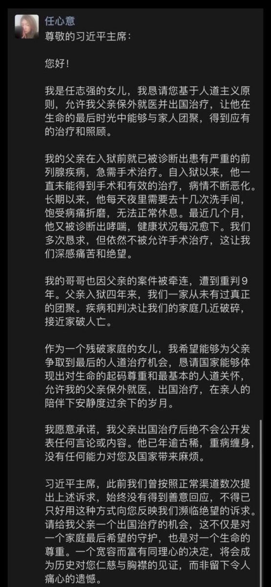 任志强,就是“皇帝的新装”的故事里,说破秘密的小孩。他本可以像绝大数犬儒主义者一样快乐得享受退休生活,但是他还是勇敢的说出来那那句。政治犯的保外就医是最麻烦的,需要到最高层。这个案件涉及到习,亲自操盘的又是蔡奇,是被抓的典型案件,恐怕真的要批到最高层。保外就医还在他们的考虑范围内,出国却万万不可能,因为他们不能够让人跑出他们的控制范围。唯一的可能性,就是造成大的舆情,让他们意识到继续监禁老任会造成不好的影响。向老任致敬!请大家转起来!