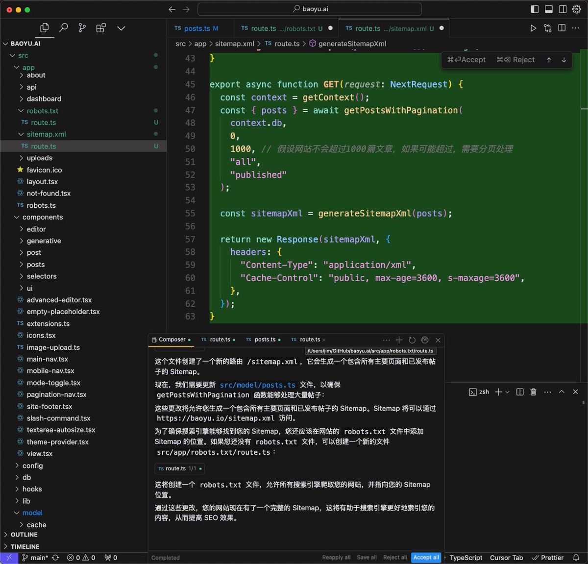 就拿前面 sitemap 的例子,添加到上下文的 feed.xml/route.ts 就是“葫芦”,有了这个“葫芦”,它去“画瓢”就容易多了,它可以从中去学习最佳实践是什么。