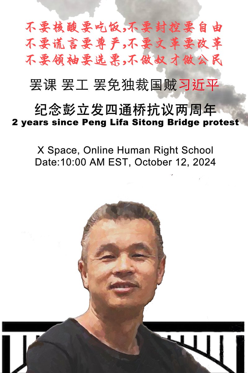 本周六10月12日美东上午10点向四通桥勇士彭立发致敬,请预留时间参加推特空间讨论。届时格雷老师 也将演唱他为彭立发所创作的新歌。