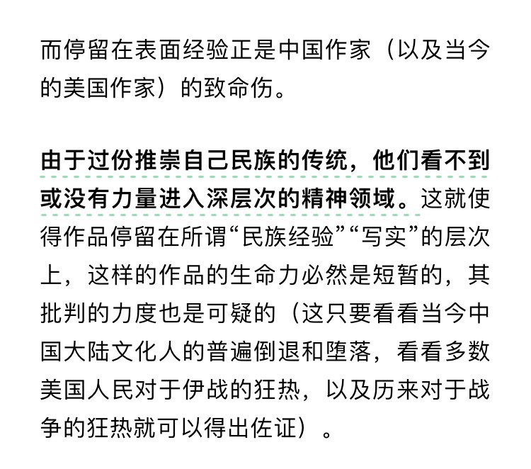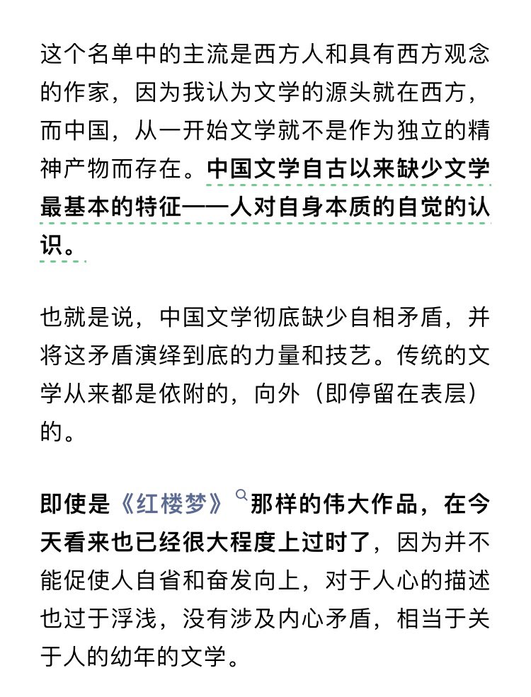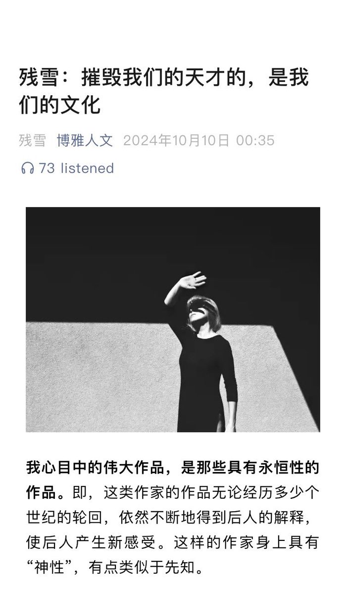 中国女作家残雪在《摧毁我们的天才的,是我们的文化》一文中说,停留在表面经验是中国作家的致命伤。她说,中国文学一开始就不是作为独立的精神产物而存在。中国文学自古以来缺少文学最基本的特征——人对自身本质的自觉的认识。中国作家如果不能战胜民族自恋情结,就无法继续追求文学理想。