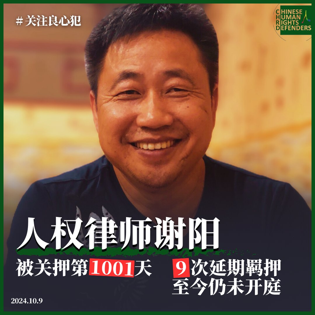 人权律师 #谢阳 被关押第1001天,至今仍未开庭!谢阳案是维权人士被迫害的缩影,他自2015年以来多次被拘押;当局将 #国家安全法武器化、#强迫失踪、#酷刑、#任意拘留、#剥夺正当程序权利 以及 #集体惩罚家属和同事,来惩罚和虐待维权人士、律师、独立记者和异议人士。