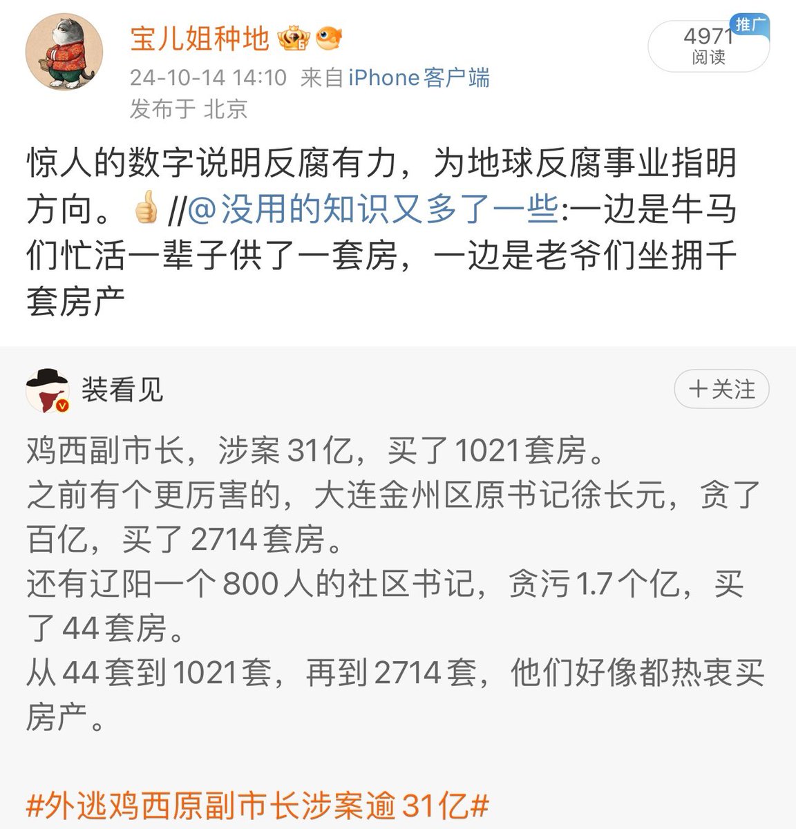 现在反腐败反出来的天文数字越来越多,微博上连支持反腐败的博文也一样被删。一个官员坐拥数千套房产,中国房地产业有多少是靠“公务员经济”撑起来的?你可以贪污,但是纳税人连阴阳怪气一下都不可以。