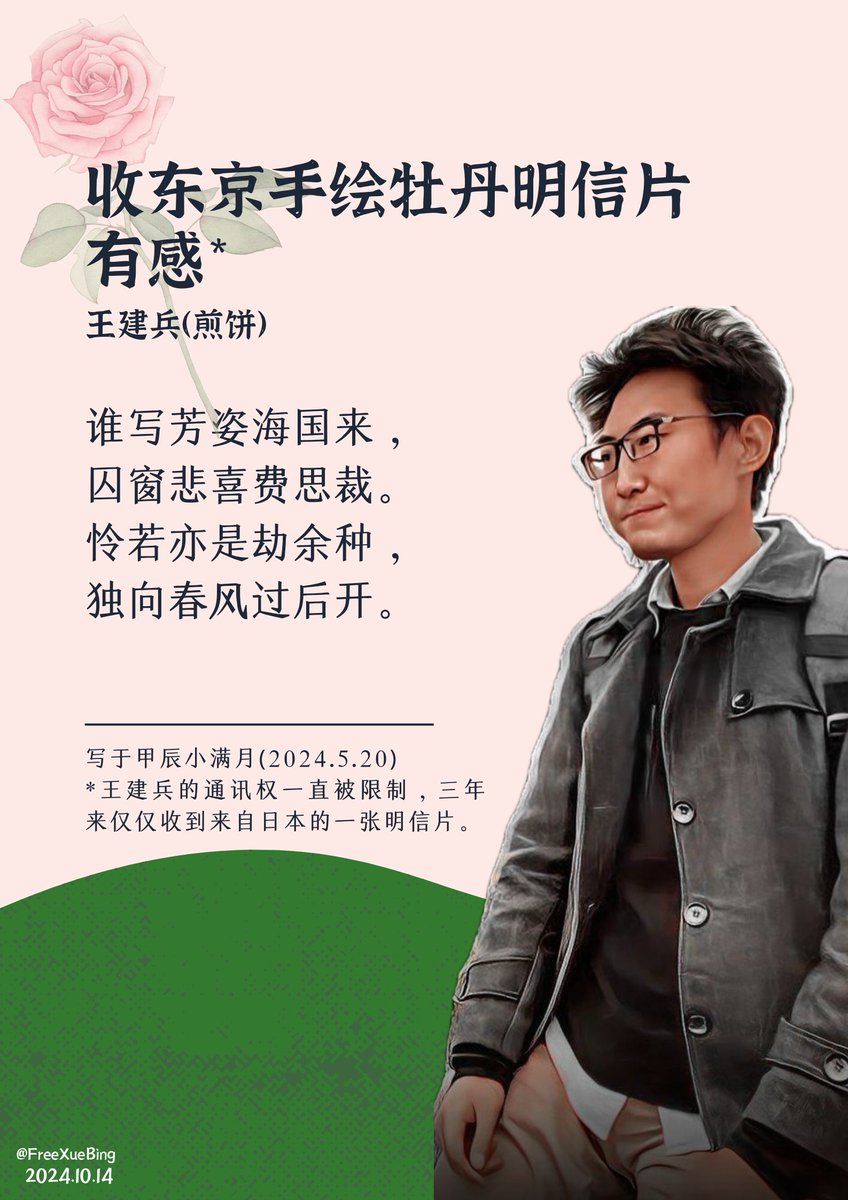 煎饼(#王建兵)关押的三年多里,仅仅在今年收到过一张来自日本的手绘牡丹明信片,这令他深受鼓舞和欣喜,“独向春风过后开”。在狱中,他写下此古体诗,表达对外界的感谢。