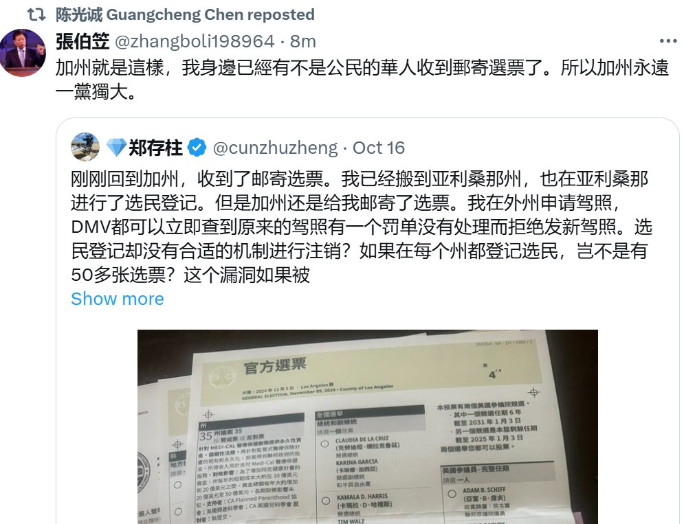 郑存柱、张伯笠、陈光诚等一大群华川粉最近宣称收到了两个邮寄选票,因此大肆攻击美国的邮寄选票有漏洞,因为有这样的漏洞,就推导出民主党和哈里斯一定会利用这种漏洞搞选举坐标,会一个选民在多个地点多次投票。这群华川粉似乎是在显摆他们的逻辑推理能力,但实际上却是在自爆愚蠢。