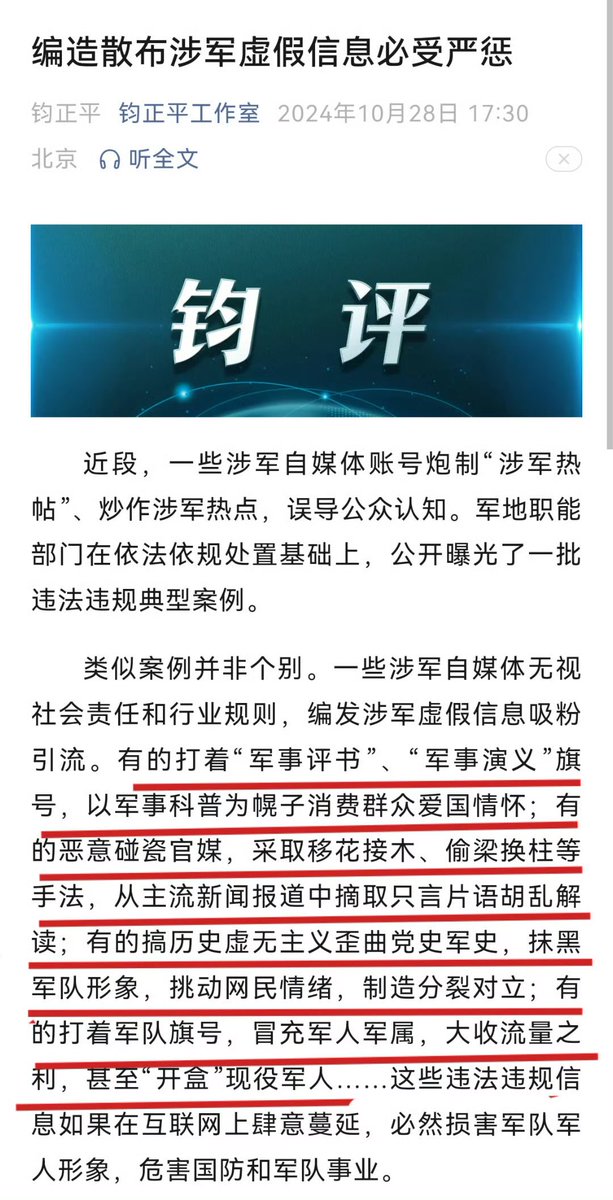 近期,军地职能部门依法处置了一批以军事科普为幌子消费爱国情怀的账号。 例如:“我舰艇击沉四艘外军军舰”,还有账号通过拼接等方式炮制军事爽文:“俄罗斯女飞行员生擒美帝F16战机”等。