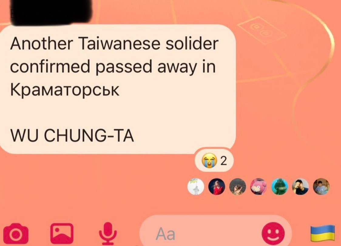 11月2日消息。一名加入乌军的台湾人吴忠达,在前线遭遇猛烈炮击牺牲,目前无人机已确定吴忠达遗体位置,待战火稍歇后会将遗体取回。 吴忠达是台湾高雄人,曾在台湾陆军特战指挥部服役多年,据悉,这是第二名在乌克兰阵亡的台湾人。