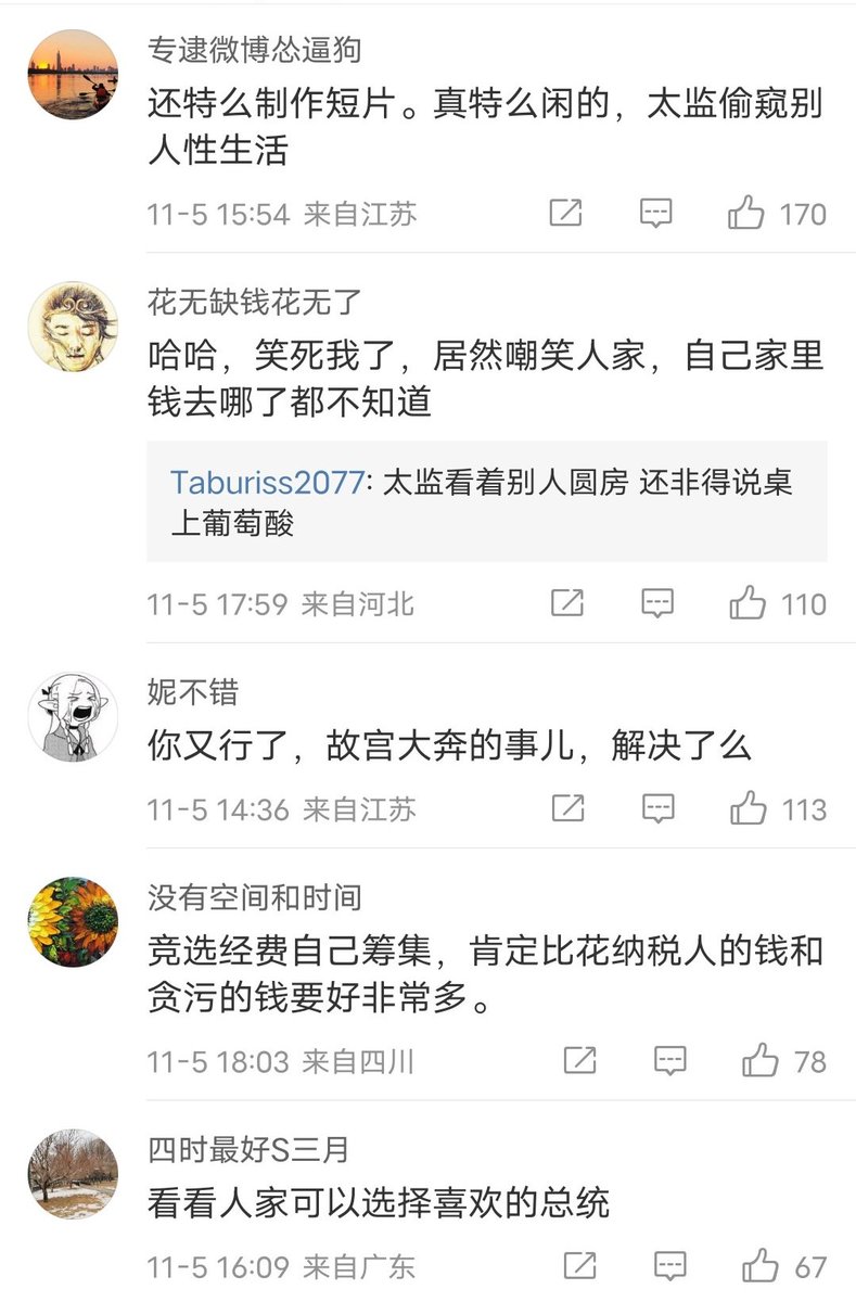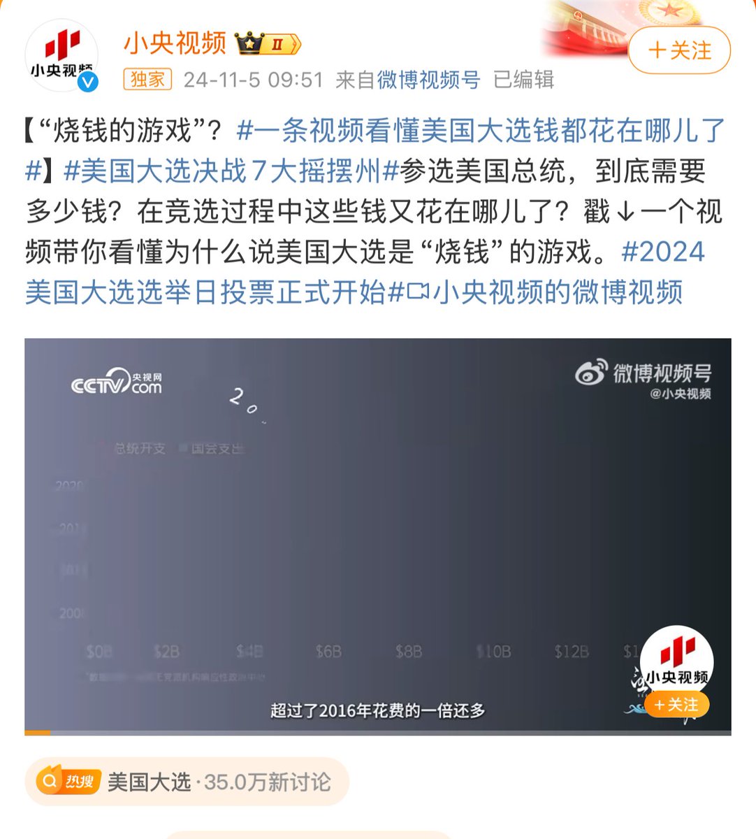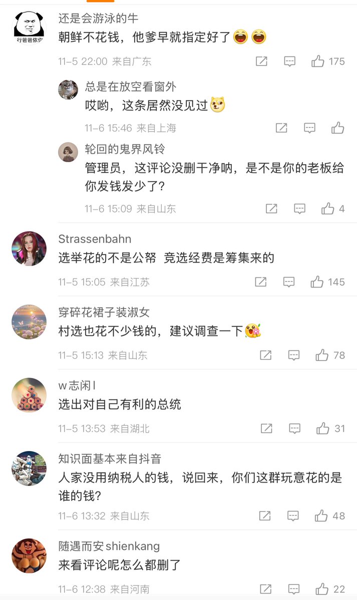 11月5日,央视发视频称,美国大选是烧钱的游戏。引发网友嘲讽。 网友回复道“朝鲜不用花钱,他爹早就指定好了” “居然嘲笑别人,自己家里的钱哪去了都不知道”