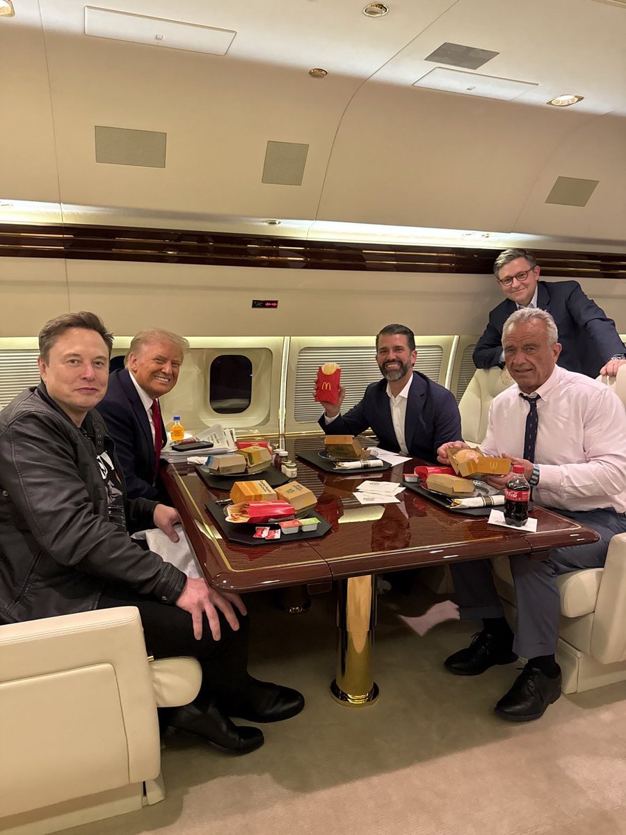 特朗普、小特朗普、埃隆-马斯克和小肯尼迪在特朗普飞机上吃麦当劳