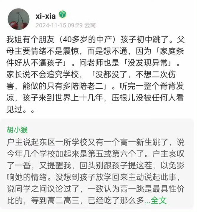 在反社会人格接二连三无差别报复社会的同时,中学生也在接二连三跳楼。可悲的是,有的中学生跳楼了,但没有人知道是什么原因,因为没有人关心过她/他,就这么不明不白的,仿佛从来没有来过这个世界。