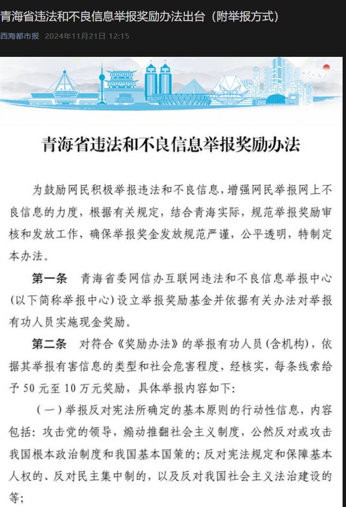 11月21日,青海省出台《违法和不良信息举报奖励办法》,鼓励民众对网上有害信息进行举报。每条线索奖励50元到10万元不等。