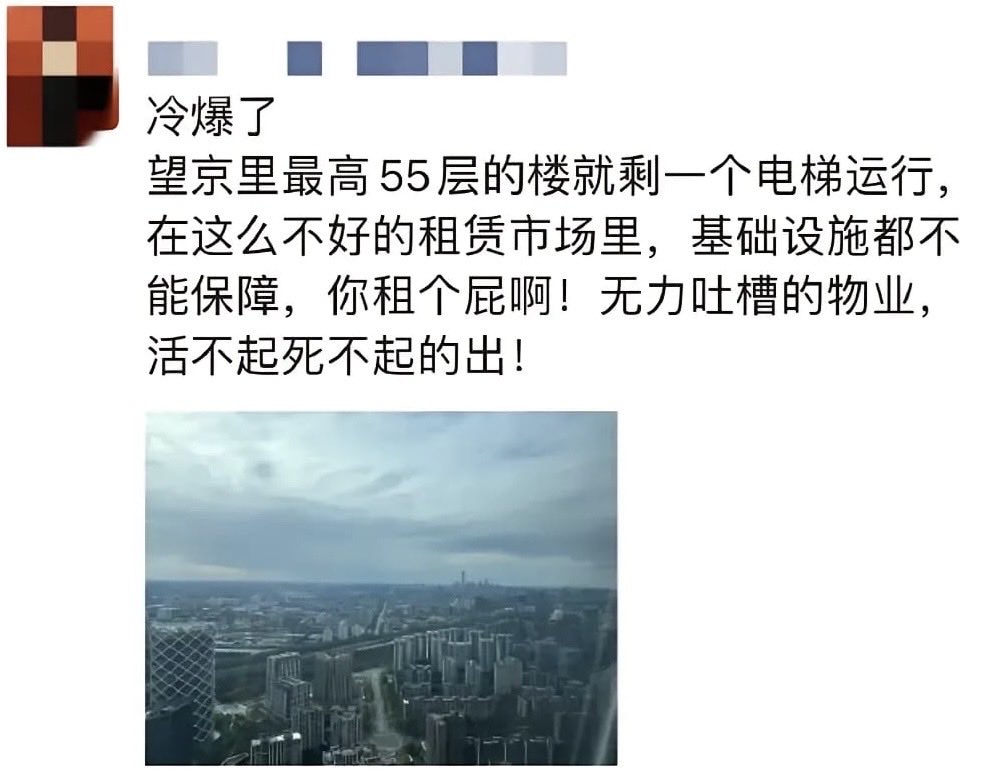 阿里离开了望京,陌陌也要离开望京。2024年一季度望京写字楼的空置率为30.2%。其中,望京SOHO的空置率已经达到43%。据说某大楼55层,只剩一个电梯运行。