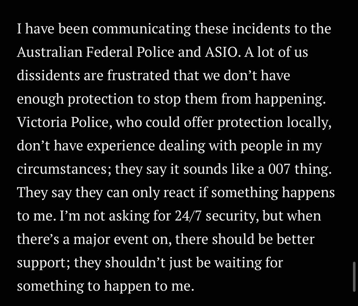 Artist provided a harrowing account of the various forms of transnational repression he faced from Chinese authorities (or persons suspected to be involved with them) while living in Australia. The