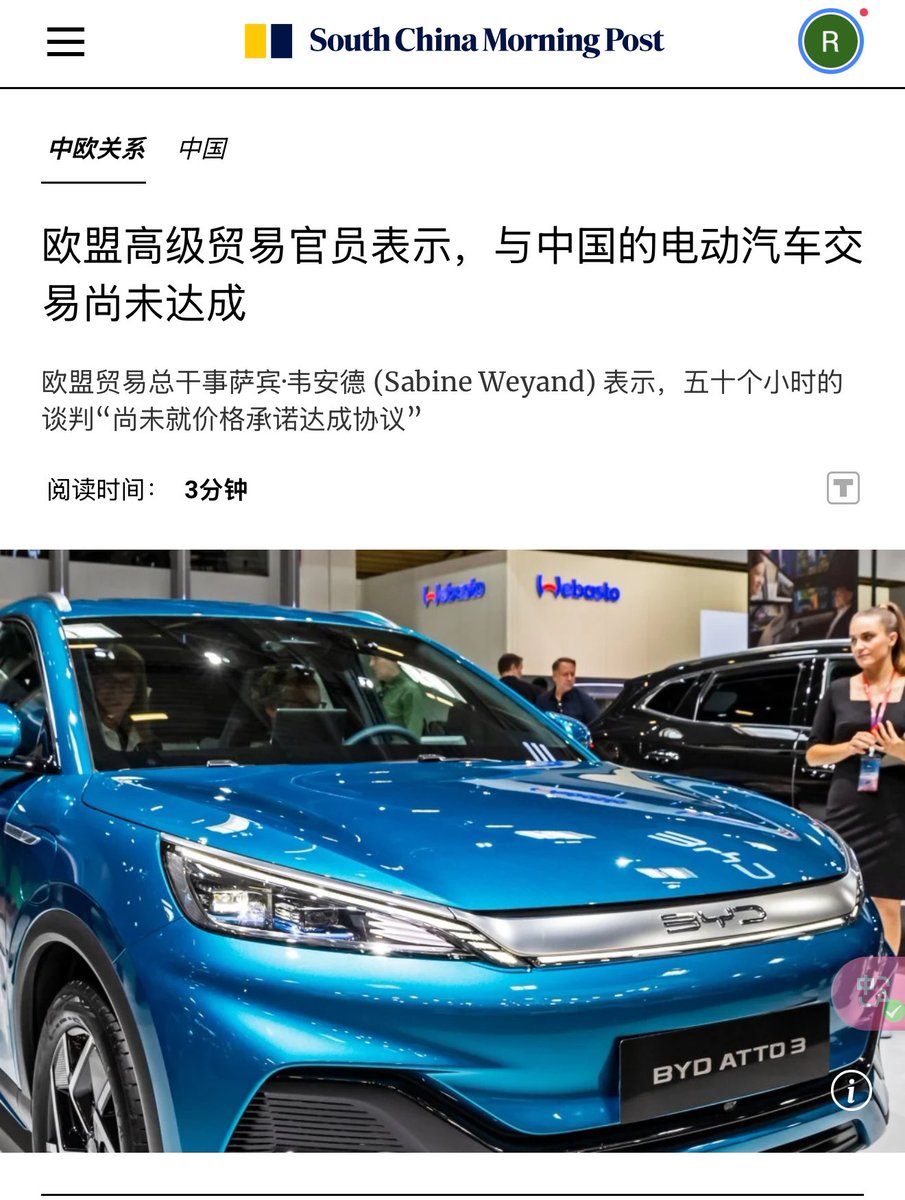 南华早报消息欧盟贸易总干事Sabine Weyand最近表示,尚未和中国电动车谈判,达成结果同时她对一些说中欧即将达成交易的报道,感到困惑