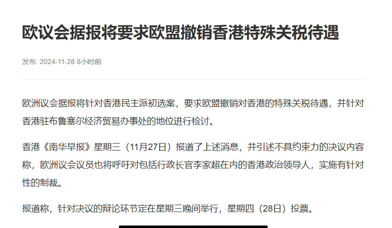 11月28日报道,欧洲议会据报针对香港民主派初选案,要求欧盟撤销对香港的特殊关税待遇。