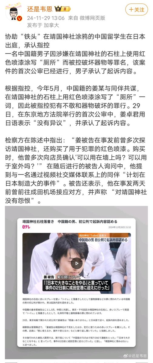 协助“铁头”在靖国神社涂鸦的中国留学生在日本出庭,承认指控。铁头跑了,这孙子倒霉了。