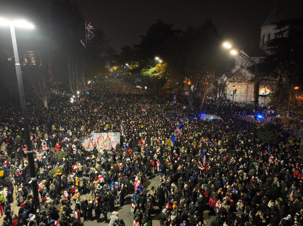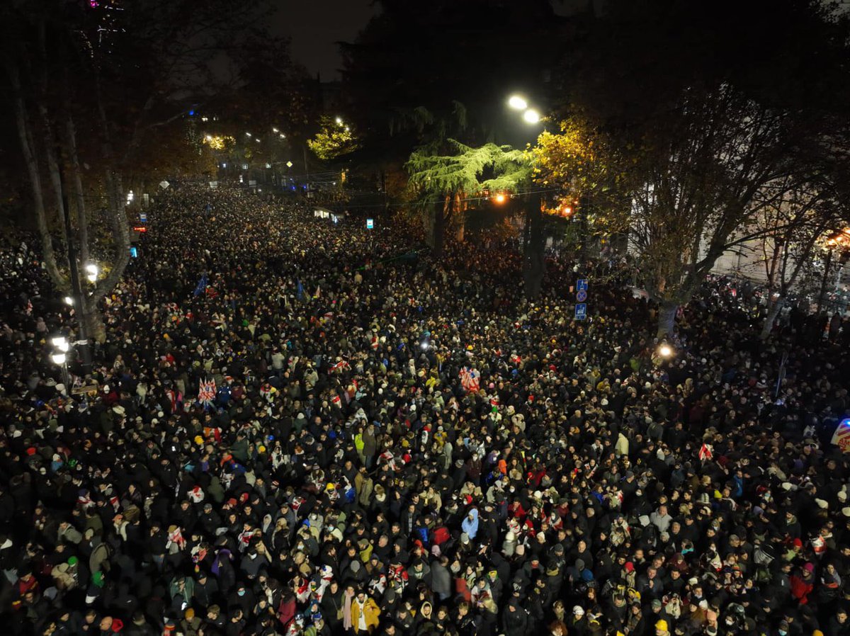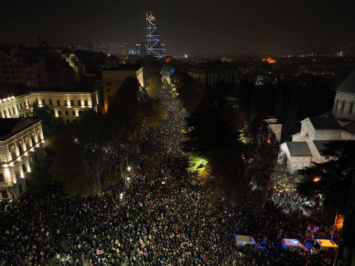 格魯吉亞第比利斯集會在鎮壓警察部隊與示威者發生衝突之前的照,照片是從高處拍攝的,可以估計抗議運動的規模。