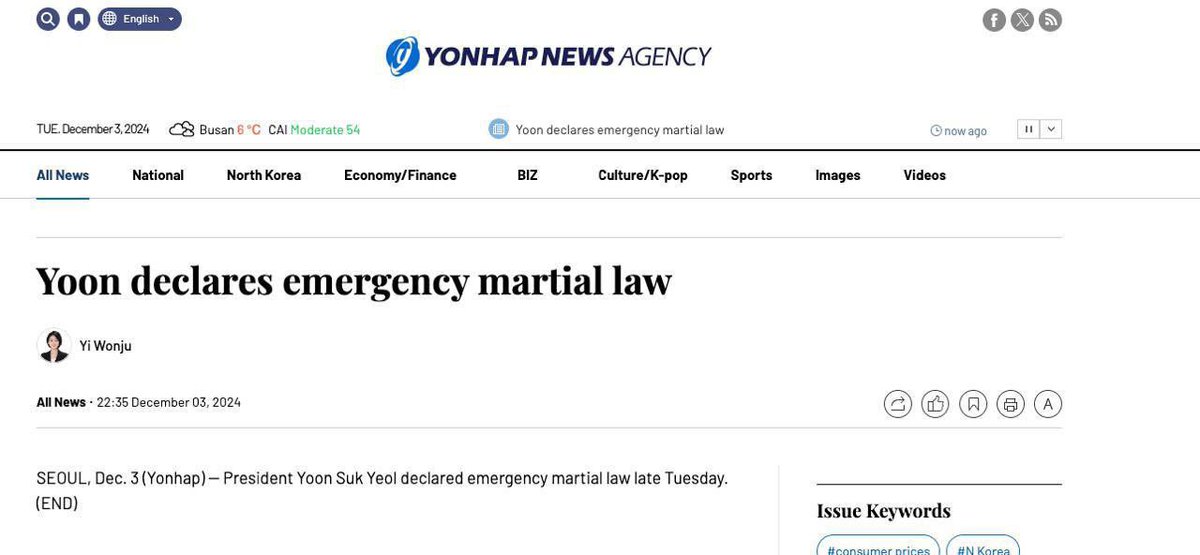 韓國實施戒嚴令—韓聯社原因是韓國總統在晚上召開緊急會議,會後宣布因試圖對他進行彈劾程序而威脅造成權力癱瘓。