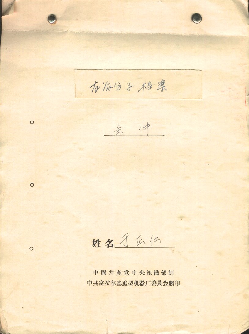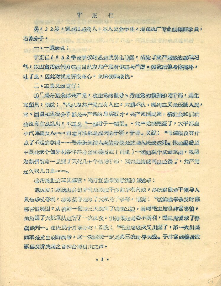 于正仁,男,22岁,家庭出身商人,本人成分学生,现在我厂专业训练班学员,右派分子。