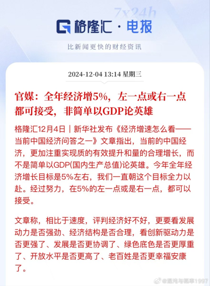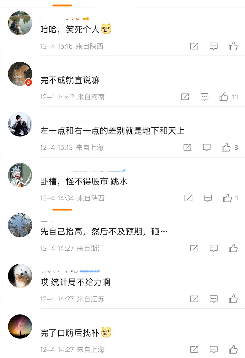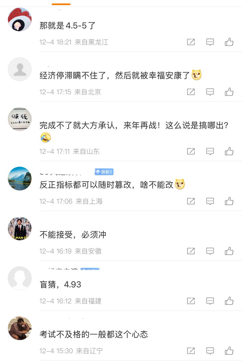12月4日,新华社发文称:今年全年经济增长目标是5%,我们一直朝这个目标全力以赴,经过努力,其实在5%的左一点或是右一点都可以接受。 网友嘲讽道“完不成就直接说嘛” “打肿脸充胖子,意思是完成不了呗”
