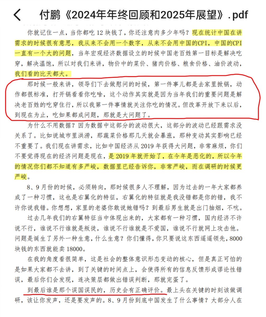 近期,经济学家付鹏在汇丰线下私享会中提到:那个时候领导们下去慰问第一件事就是去家里掀锅盖,关注你吃的情况,但改革开放下来以后,到现在为止,吃如果都成问题,那就是大问题了。 “到最后谁是那个误国误民的,历史会有正确评价” 目前,付鹏的这段讲话整正被中国各平台陆续删除。
