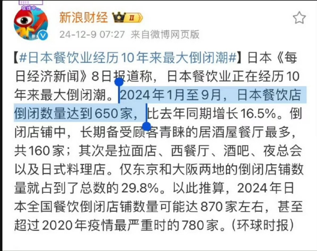 网友:根据目前的统计资料,日本的餐馆约60多万家。也就是说,每一千家才有一家倒闭。我怀疑这媒体是在说脱口秀。