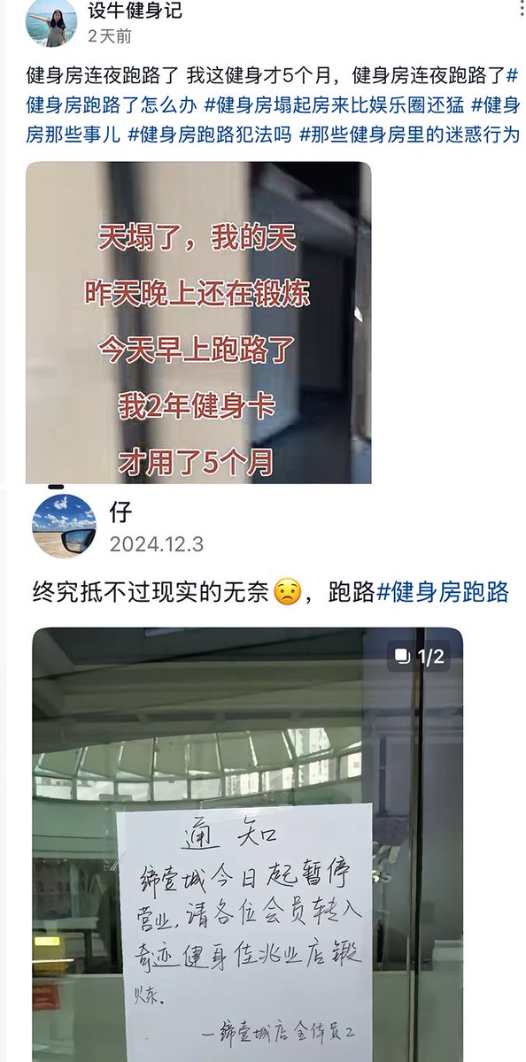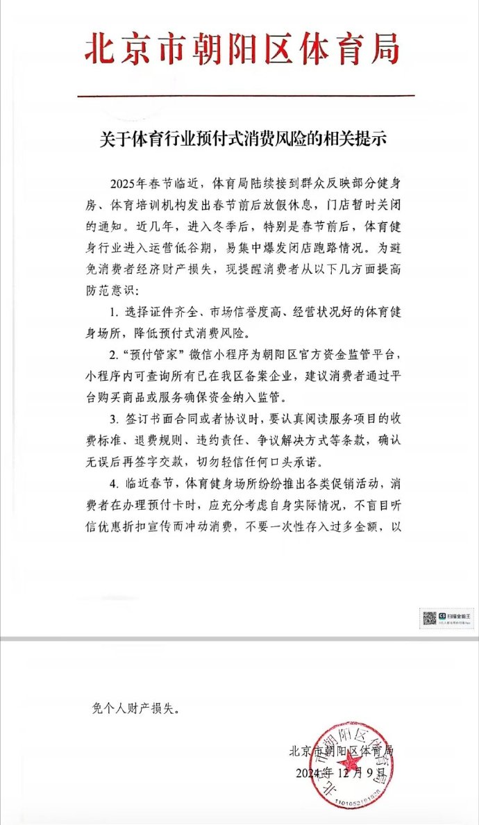 春节临近,全国多地健身房跑路事件层出不穷。 12月9日,北京朝阳区体育局发布风险提示:提醒消费者选择经营状况良好的健身场所,签合同时认真阅读条款,切勿轻信口头承诺,不要一次性充值过多金额。